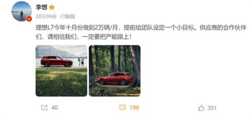 面對(duì)理想汽車在2023年取得的成績(jī)CEO李想感到并不滿足,在自己的個(gè)人微博平臺(tái)中發(fā)文表示應(yīng)該給自己的團(tuán)隊(duì)提前設(shè)置一個(gè)目標(biāo),在2023年的10月份將理想L7車型的銷量做到單月2萬(wàn)輛,希望理想汽車所有的合作伙伴和供應(yīng)商給予理想汽車品牌足夠的信心,將自己的工作做到極致,供應(yīng)商要及時(shí)為車企提供足夠的產(chǎn)能支持。