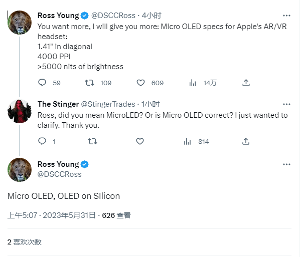IT之家 5 月 31 日消息,多方消息源表明蘋果將在即將召開的WWDC 2023開發(fā)者大會上宣布首款A(yù)R/VR頭顯。屏幕供應(yīng)鏈咨詢公司DSCC的首席執(zhí)行官羅斯?楊(Ross Young)在今天的推文中分享了關(guān)于頭顯屏幕的更多細(xì)節(jié)。