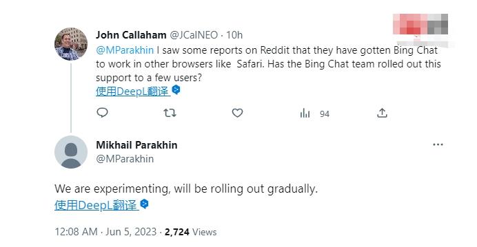 本周末,必應(yīng)的Reddit頁面上出現(xiàn)了一個帖子,展示了必應(yīng)聊天在蘋果Safari和谷歌Chrome瀏覽器中運行的截圖。IT之家通過Twitter向Parakhin確認了這一消息,他證實了該功能正在進行實驗,并表示將逐步推出。目前尚未透露具體哪些第三方瀏覽器將獲得必應(yīng)聊天的支持。