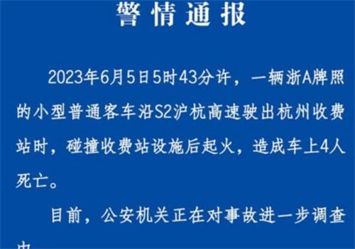 就在近期有關(guān)于新能源汽車安全的問(wèn)題再次引發(fā)爭(zhēng)議,在北京時(shí)間2023年的6月5日杭州地區(qū)的公安局高速公路交通支隊(duì)發(fā)布公告表示。在2023年的6月5日凌晨5:43左右有一輛浙江地區(qū)客車在行駛出杭州高速公路收費(fèi)站的時(shí)候,車體本身碰觸到了收費(fèi)站的設(shè)施最后發(fā)生起火,最終在火勢(shì)撲滅以后發(fā)現(xiàn)客車上的4名乘客已經(jīng)身亡,針對(duì)于起火的具體原因,目前相關(guān)部門還在進(jìn)一步調(diào)查。
