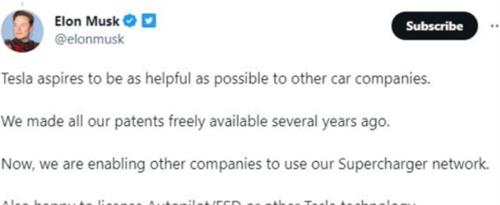 在推特平臺中就通用汽車公司的發文馬斯克做出了回應表示特斯拉汽車公司會竭盡所能去幫助所有新能源領域中的汽車制造商,在幾年前特斯拉公司就已經正式宣布將免費開放公司旗下所有的專利?,F在特斯拉汽車主要的目標是幫助其他新能源汽車制造商的發展,已經有許多的公司開始使用特斯拉汽車公司的充電站,另外馬斯克表示也很愿意將自己公司旗下Autopilot / FSD等多項技術免費分享給其他企業。