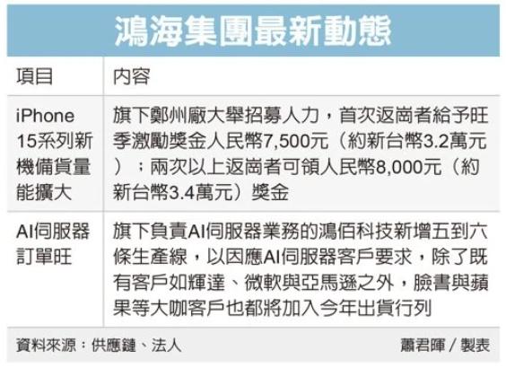 近期,蘋果即將發(fā)布iPhone 15系列新機,導致最大的代工廠鴻海旗下鄭州廠大規(guī)模招募人員,為首次返崗者提供旺季激勵獎金。富士康鄭州科技園區(qū)的招聘動態(tài)顯示,該廠區(qū)正在持續(xù)擴大正式員工的招聘規(guī)模,并專門招募離職返崗者。對于首次返崗者,入職底薪為人民幣2,200元,并提供旺季激勵獎金人民幣7,500元;對于多次返崗者,旺季激勵獎金可達人民幣8,000元。