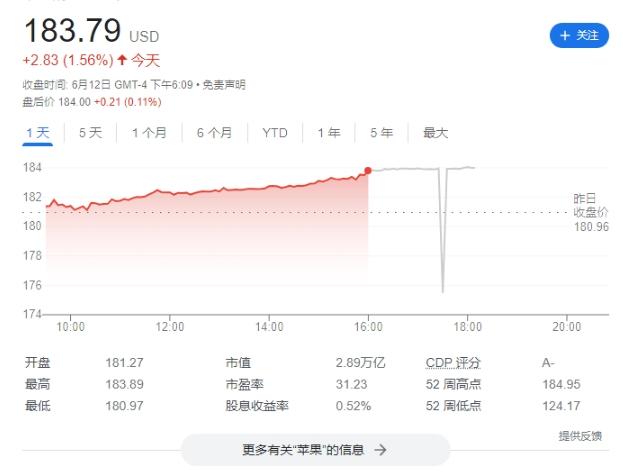 據(jù)IT之家報道,蘋果公司(AAPL)在WWDC 2023開發(fā)者大會一周后,股價刷新了收盤價紀錄,收于每股183.79美元。這一新高是在蘋果推出Vision Pro頭顯后實現(xiàn)的。