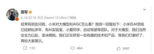 小米集團的創始人雷軍曾發言表示,目前小米公司正在研發一些有關于人工智能領域的技術和相關的產品,等待技術完全成熟以后,才會正式向所有的消費者公布。小米集團的總裁盧偉冰表示小米集團旗下的人工智能專家團隊已經超過了1200人次,和其他的科技企業一樣,小米集團也會及時將人工智能作為戰略布局的重要部分,不過不會像Open al公司一樣僅僅只是做一個通用的語言大模型。