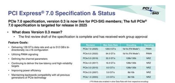 根據草案中披露的信息,PCIe 7.0將繼續使用PCIe 6.0的PAM4調制信號和1b/1b編碼模式,同時向下兼容之前的所有PCIe版本。
