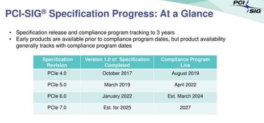 此前,PCIe 3.0和4.0之間相隔了長達6年的時間,而自從4.0版本以后,PCI-SIG組織基本上每兩年發布一次新的迭代版本。