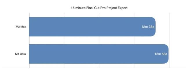 而在M2 Ultra芯片的測試中,經過對Blender 3D和3DMark等GPU密集型應用的測試,M2 Ultra的性能是M2 Max的兩倍,在Final Cut Pro的測試中,導出速度翻倍。測試結果還顯示,M2 Ultra的GPU性能是M1 Ultra的兩倍。