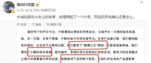 新出行CEO賀磊在社交平臺(tái)中表示,長(zhǎng)城汽車在最近一次的股東大會(huì)中為理想汽車的市場(chǎng)營(yíng)銷做法起了一個(gè)外號(hào)叫做微博之王。據(jù)賀磊在社交平臺(tái)中的內(nèi)容講述長(zhǎng)城在最近一次的股東大會(huì)中表示,在當(dāng)前的新能源汽車快速發(fā)展時(shí)代中,出現(xiàn)了許多優(yōu)秀的新能源汽車制造商,長(zhǎng)城汽車在未來(lái)發(fā)展的過(guò)程中將會(huì)鞏固基礎(chǔ),另一方面將會(huì)向其他行業(yè)中的優(yōu)秀企業(yè)學(xué)習(xí)。