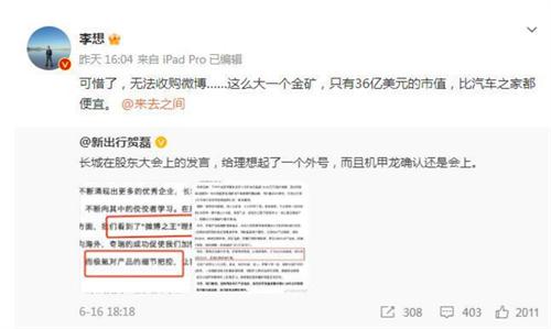 在得知理想汽車被調(diào)侃為微博之王以后,理想汽車公司的CEO理想在自己的社交平臺(tái)中表示自己感到十分的可惜,雖然平臺(tái)現(xiàn)在只有36億美元的市值,比汽車之家都要低依然沒(méi)有辦法收購(gòu)掉微博平臺(tái)。