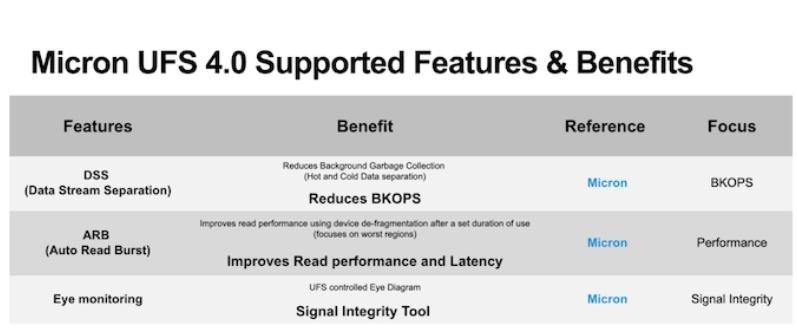 美光 UFS 4.0存儲(chǔ)模塊采用兩個(gè)M-PHY Gear 5通道進(jìn)行數(shù)據(jù)傳輸,并支持諸如Data Stream Separation、Auto Read Burst和Eye Monitoring等專(zhuān)有固件功能。這些功能的結(jié)合使得存儲(chǔ)模塊具備出色的性能和穩(wěn)定性。