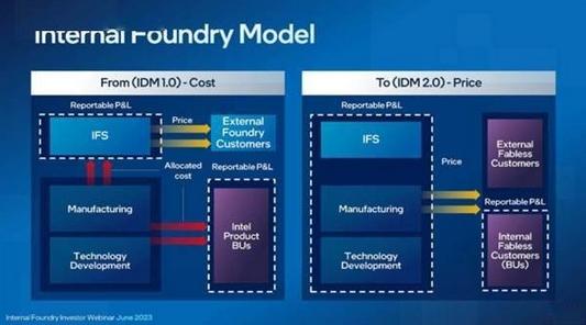 與AMD不同,英特爾拆分了晶圓制造業(yè)務(wù),但并未出售,仍然是公司的核心部門,這種模式被稱為IDM 2.0。英特爾希望拆分出的IFS代工部門既能接受自家的訂單,也能接受外部的訂單,與臺積電和三星展開市場競爭。