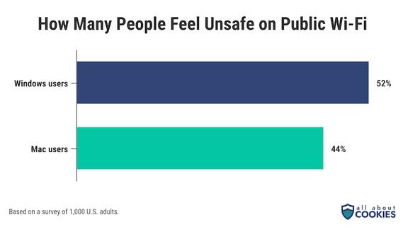 報告還顯示,在對公共Wi-Fi的安全性看法上,相比于Mac用戶(44%),PC用戶(52%)更認(rèn)為公共Wi-Fi不夠安全。