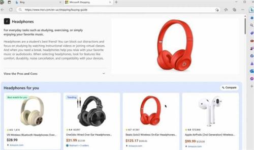 微軟表示將在全球范圍內推出基于生成式人工智能的用戶評價摘要功能。舉例來說,當用戶購買耳機時,他們可以在Edge瀏覽器的側邊欄中打開Bing Chat,Bing將根據音質、舒適度、設備兼容性等購物因素向用戶提供建議。