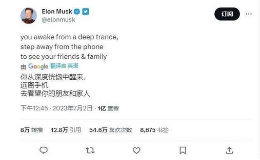 馬斯克不僅以限制第三方抓取推特數據為理由限制用戶的瀏覽量,還在推文中補充說:“我限制推文瀏覽量的原因是因為我們都對推特上癮了。每天我們都在沉迷于虛擬世界。我這樣做是為了對這個世界做一件好事,我們應該遠離手機,多參與社交活動,多與朋友和家人交流。”馬斯克在推文的最后還開玩笑說:“你又使用了一次瀏覽次數。”