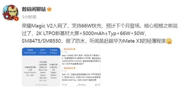 此前,數碼博主 @數碼閑聊站 透露了一些關于榮耀 Magic V2 的消息。據稱,該手機將采用 2K LTPO 新基材大屏幕,并搭載了高容量的 5000mAh 電池,支持 66W 有線快充和 50W 無線快充。此外,該手機可能搭載 SM8475(驍龍 8+ Gen 1)或 SM8550(驍龍 8 Gen 2)芯片,并具備防水功能。