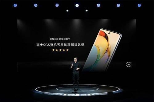 姜海榮表示,榮耀X50搭載了全新的“榮耀太極緩震架構”,采用創新的低模量緩震材料,通過“以柔克剛”的原理實現了手機各個部位的抗摔能力。這種設計使得榮耀X50能夠在多個方向上抵抗摔落造成的沖擊,十面無死角地保護手機的安全。榮耀X50還成為全球首款獲得瑞士SGS整機五星抗跌耐摔認證的手機。