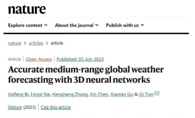 在科技的快速發展中,人工智能(AI)正逐漸滲透到各個領域,為人類帶來了前所未有的機遇和挑戰。最近,《自然》雜志正式刊登了華為云盤古大模型研發團隊的重大突破——《三維神經網絡用于精準中期全球天氣預報》("Accurate medium-range global weather forecasting with 3D neural networks")。這一成果引起了廣泛的關注,也為氣象領域帶來了全新的希望。