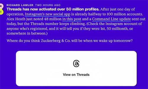 在美國當(dāng)?shù)貢r間2023年的7月6日,扎克伯格在自己的社交平臺中發(fā)文表示,截止到當(dāng)天為止新平臺Threads的注冊人數(shù)已經(jīng)要達到了3,000萬人次。Instagram平臺中主要負責(zé)產(chǎn)品業(yè)務(wù)的副總裁康納·海耶斯表示在長時間內(nèi)推特平臺一直在社交領(lǐng)域中占據(jù)著主導(dǎo)地位,就在前段時間推特平臺的CEO馬斯克宣布將會限制用戶瀏覽推文的數(shù)量,公司的多個高層管理人員認(rèn)為,現(xiàn)在就是發(fā)布新社交平臺的最好機會,也可以讓用戶擁有更多的選擇。