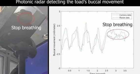 在設備效果的評估中,研究人員分別使用人類呼吸模擬器和動物進行了測試。通過人類呼吸模擬器的應用監測,結果顯示光子雷達可以準確實時地檢測到兩個目標之間約3.9英寸(10厘米)的呼吸速率,并能檢測到毫米級的不規則呼吸模式,包括較長的吸氣和較短的呼氣,以及呼吸的暫停。通過對蟾蜍呼吸的視頻記錄,并與從該設備中提取的實時數據進行比對,研究人員發現該設備能夠準確測量動物的呼吸速率,包括兩棲動物常見的間歇性呼吸。