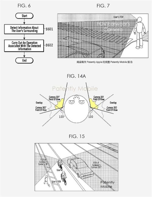 IT之家提供了專利設計草圖,其中耳機上的相機在監(jiān)測到附近有汽車時,可以自動與佩戴者進行交互并發(fā)出提醒。