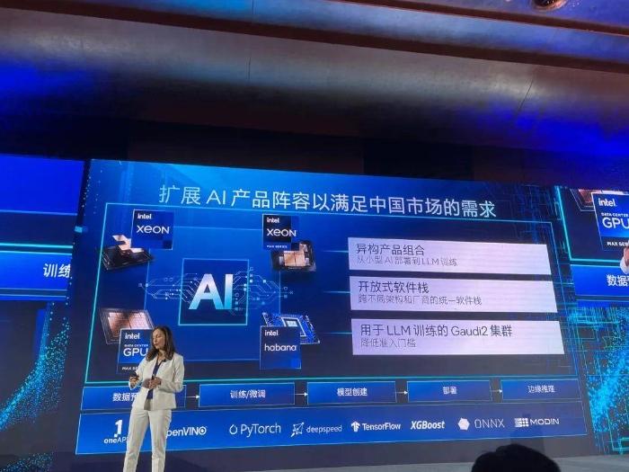 此外,英特爾還提到了其通用計(jì)算和加速計(jì)算的產(chǎn)品線。在通用計(jì)算方面,英特爾的第四代至強(qiáng)處理器(英特爾AMX)提供了高性能的AI推理和訓(xùn)練能力,滿足了大部分模型較小場(chǎng)景的需求。而Gaudi2作為加速計(jì)算的解決方案,則專注于大模型的訓(xùn)練和推理需求。