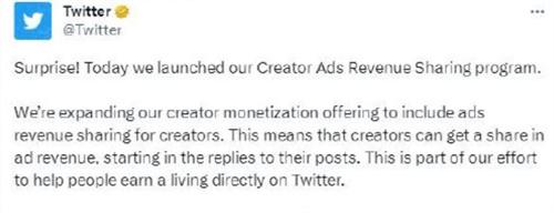 推特平臺(tái)官方表示,此次的創(chuàng)作者廣告收入分享計(jì)劃主要面向的群體是日常生活主要來源都依靠于推特平臺(tái)的用戶群體,在之前平臺(tái)中就已經(jīng)正式推出了創(chuàng)作者付費(fèi)訂閱的服務(wù),也就相當(dāng)于中國(guó)市場(chǎng)中的內(nèi)容付費(fèi)。在官方消息正式公布以后,已經(jīng)有一批創(chuàng)作者開始在平臺(tái)內(nèi)分享自己已經(jīng)獲得廣告收入分享的截圖。