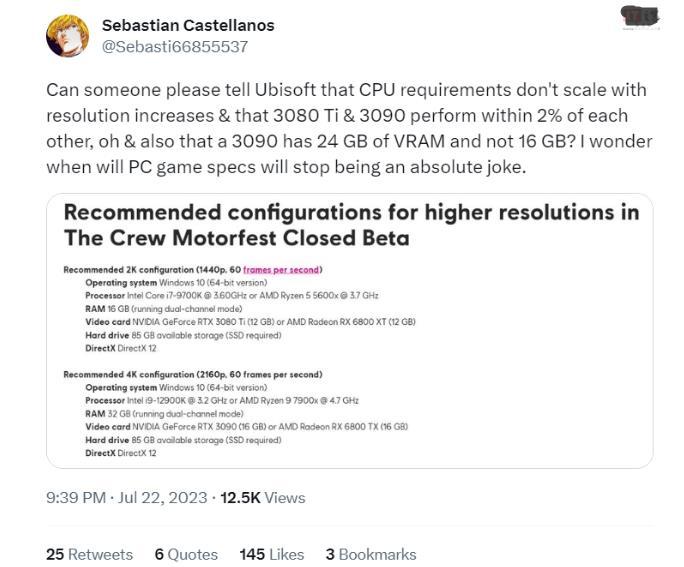 IT之家 7月23日消息,Twitter用戶Sebastian Castellanos發文吐槽,育碧《飆酷車神:轟鳴盛典》封測PC推薦配置出現低級錯誤,甚至將顯卡名字拼寫錯誤。