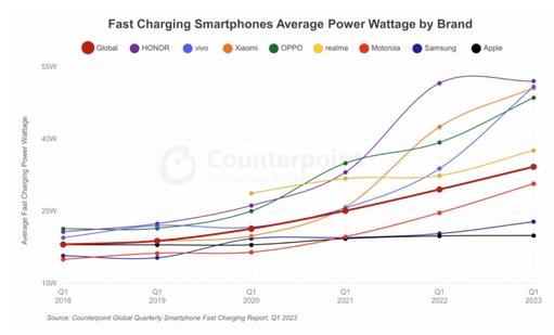 根據報告數據顯示,2023年第一季度,全球快速充電智能手機的平均功率達到34W。值得注意的是,許多熟悉的品牌如小米、OPPO、vivo、榮耀等均位于平均功率線之上,展現出強大的快充技術實力,而蘋果和三星則位于平均功率線以下。