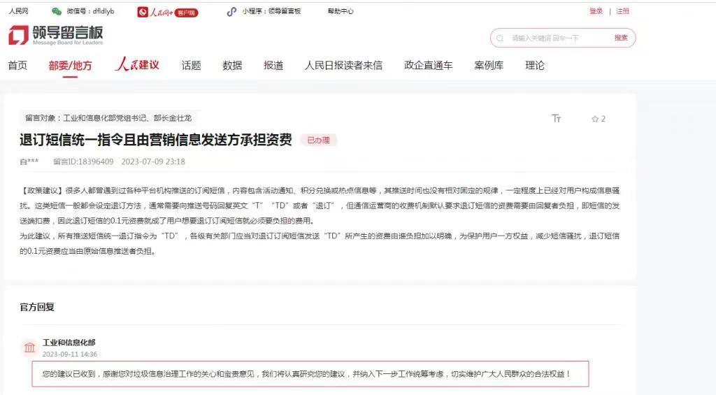 之前有網(wǎng)友在領(lǐng)導(dǎo)留言板留言,表示很多人都接受過(guò)各種平臺(tái)機(jī)構(gòu)的推送訂閱短信,如果想要退送這些訂閱短信,必須回復(fù)對(duì)應(yīng)的英文字母或者漢字。用戶回復(fù)的這一條費(fèi)用是用戶自己承擔(dān),所以退訂短信的0.1元資費(fèi)成為用戶想要退訂訂閱短信必須要負(fù)擔(dān)的費(fèi)用。工業(yè)和信息化部在9月11日回復(fù)稱:“您的建議已收到,感謝您對(duì)垃圾信息治理工作的關(guān)心和寶貴意見。我們將認(rèn)真研究您的建議,并納入下一步工作統(tǒng)籌考慮,切實(shí)維護(hù)廣大人民群眾的合法權(quán)益。”