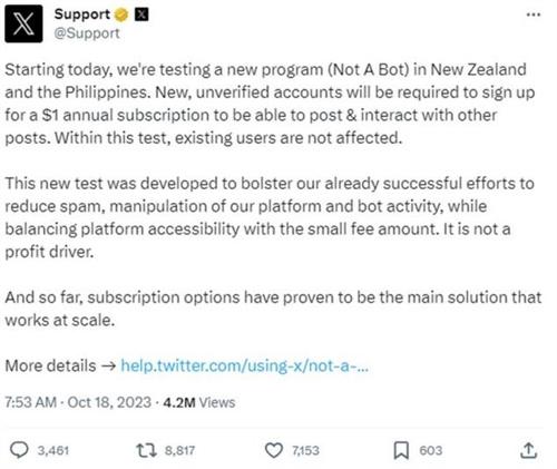 馬斯克旗下的社交平臺X本次再一次迎來相關更新,在一份聲明中表示會向新加入的用戶每年收取1美元的費用來解鎖互動功能。該平臺的規則會首先在新西蘭以及菲律賓試行,新用戶必須加入對應的計劃,才能夠創建使用各種各樣的主要功能,包括推文、回復、引用、轉發等等。