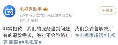 在北京時間2023年11月21日,有關于知名APP電視家跑路的話題,登上了各大平臺的熱搜榜,有許多的網友在社交平臺內發(fā)文,表示自己已經使用了幾年的電視家APP突然無法正常打開。另外,有許多的網友表示,自己此前開通的會員還沒有到期,現在無法正常觀看。面對即將跑路的傳聞,電視家官方迅速做出了回應表示,目前公司的服務方面出現了問題,如果用戶已經開通了會員,那么用戶此前的付款將全部退還。所有用戶的退款請求公司都會立即處理堅決不會跑路。