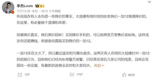 近期,關(guān)于一加12新機(jī)降價(jià)的相關(guān)新聞,快速引起網(wǎng)友關(guān)注。針對(duì)于“一加12渠道降價(jià)”的相關(guān)傳聞,中國(guó)區(qū)總裁李杰在官方微博中也發(fā)出回應(yīng)。李杰在文中明確指出:如果降價(jià)真實(shí),我們?cè)瓋r(jià)回收。買到降價(jià)手機(jī)的,可以按照官方零售價(jià)賣給我。這樣或許你還能賺錢,前提是你真能買到降價(jià)的一加12。同時(shí)李杰還指出公司已經(jīng)向東莞警方報(bào)警,查實(shí)散布謠言幾家公司的線索,目前正在固化一些證據(jù),最新的進(jìn)展也會(huì)及時(shí)的同步出來。