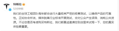 在2023年12月14日,特斯拉汽車公司官方通過微博平臺發文表示,公司旗下的全球工程團隊每一年都會進行多次條件極其嚴格的冬季測試來確保產品在冬季行駛的可靠性。按照中國汽車工業協會的說法,媒體所展開的汽車測試已經脫離了行業標準,最終的測試結果會對公眾造成誤導,另一方面也會消耗公共資源。此外特斯拉汽車公司官方表示,無論消費者是否考慮購買特斯拉汽車品牌的新能源汽車,都非常希望消費者能夠在店中試駕,感受最真實的體驗。