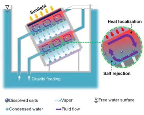 該技術可以直接在離網或海島地區使用,有效解決當地淡水短缺的問題。采取這種設計方案,在進行尺寸放大之后甚至可以降低表面積和熱損,實現更好的性能提升。該技術在耐鹽度方面有獨特的優勢,可以用在一些需要進行高濃度鹽水濃縮的場景中。
