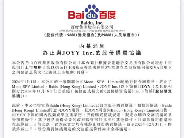 百度在港交所發布公告稱,2024年1月1日,本公司的一家關聯公司Moon SPV Limited通過行使合同權利,終止該公司、百度與歡聚集團以及其他相關方于2020年11月16日訂立,并經日后修訂或補充的《股份購買協議》。