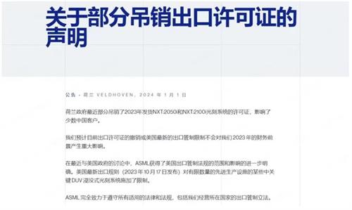 1月1日晚上,荷蘭光刻機巨頭ASML在官網(wǎng)上發(fā)布聲明表示:2050i及NXT:2100i光刻系統(tǒng)的出口許可證已經被荷蘭政府部分撤銷,將會對個別中國客戶產生影響。公司在該聲明中明確指出,在近期的溝通中,美國政府對其出口管制的適用范圍和影響做了進一步澄清。美國2023年10月17日發(fā)布的最新出口管制規(guī)則,限制向個別先進芯片制造晶圓廠發(fā)運特定型號的中高端DUV浸潤式光刻機。公司預計此次出口許可證撤銷即最新的美國出口管制限制不會對2023年的財務情況產生任何重大影響。
