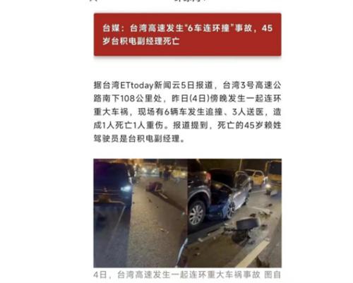 1月4日傍晚,臺灣3號高速公路南下108公里處發生連環重大車禍,現場有6輛車發生追撞,三人送醫,造成一人死亡,一人重傷,死亡的45歲賴姓駕駛員是臺積電副經理。現場各種物品散落一地,不僅輪胎直接被撞掉,還有兩名傷者躺在地上,六臺車輛幾乎全部粘在一起。