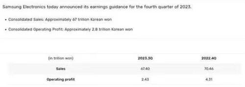 北京時間1月9日,三星電子公布2023年第四季度財報指引。在數據中可以看到三星電子營業利潤連續第六季度下滑,去年全年盈利同比暴跌85%。去年第四季度,三星營業利潤下降35%,至2.8萬億韓元,折合人民幣約為153億。2023年前三個季度,三星電子的營業利潤分別為6,400億,韓元6,700億韓元和2.43萬億韓元。至2023年年底,三星電子全年營業利潤為6.54萬億韓元,折合人民幣約為356.68億元,同比減少84.92%,全年的營收為258.16萬億韓元,折合人民幣約為1.4萬億,同比減少14.58%。
