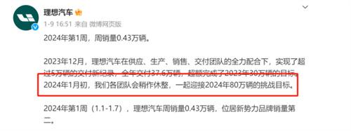 在2024年開年第1周,大多數(shù)車企的銷量都出現(xiàn)了不同程度的下滑,這和新年假期,購置稅減免調整等多個因素有關。理想汽車官方在發(fā)布銷量排行榜時表示,公司已經(jīng)超額完成了2023年30萬輛的年終目標,在2024年1月份初,團隊將會稍作調整,一起準備迎接2024年年銷量80萬輛的目標。