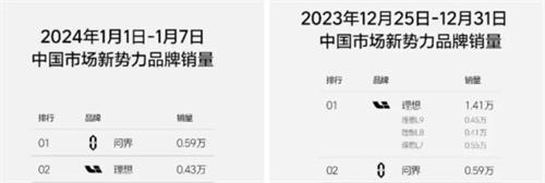 在2024年第1周,理想汽車按照慣例發(fā)布了近一周時間內新勢力品牌的銷量排行榜,在榜單中,理想汽車的排名下滑被問界反超。據(jù)榜單顯示,問界在第1周的銷量達到了0.59萬輛,第1次超過了理想汽車,位于排行榜第1名。隨后,華為旗下智能汽車解決方案bu董事長余承東借用這一排行榜截圖,在朋友圈里發(fā)文表示這僅僅只是一個開始,問界在日后將會持續(xù)保持增長勢頭。