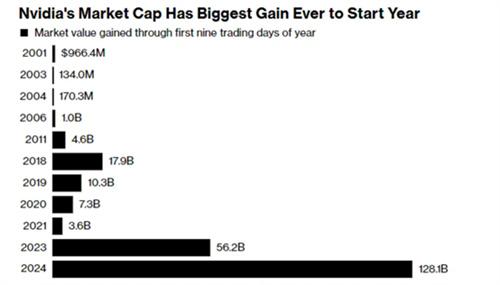 英偉達公司在2024年依舊保持了股價的增長趨勢,甚至有希望能夠再次創造有史以來最強勁的年度開局。根據行業數據顯示,在剛剛結束的9個交易日內,英偉達公司的股票價格已經上漲了10%,公司總市值增長了1,280億美元。在英偉達公司歷史中,這是剛剛進入新一年9天時間內市值增長幅度最多的一次。