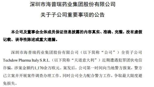 在1月14日晚上,海普瑞官方發(fā)布公告表示,旗下子公司Techdow Pharma Italy S.R.L.在近期遇到了電信詐騙,涉案金額達(dá)到了1,170萬歐元。案件發(fā)生以后,公司已經(jīng)在第一時(shí)間向當(dāng)?shù)叵嚓P(guān)部門報(bào)警,警方現(xiàn)在已經(jīng)正式立案并展開調(diào)查工作。海普瑞官方表示將會盡力配合警方工作,爭取最大程度減少公司的損失。經(jīng)過警方初步判斷認(rèn)為該案件屬于偶發(fā)事件,目前公司仍處于正常經(jīng)營狀態(tài)。