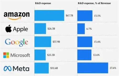 近日,有一張關于2022年納斯達克排行榜前10企業的研發支出圖受到了整個行業的關注,從圖片中可以看出,亞馬遜位于排行榜的第1名,以732億美元的研發費用遙遙領先于其他的9個企業。谷歌母公司Alphabet研發費用為395億美元位于第2名,第3名是Meta,全年研發總費用為277億美元,第4名是蘋果全年研發支出費用為277億美元。