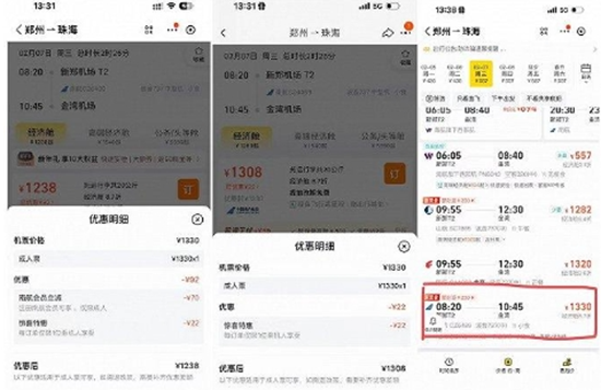 根據這名游客在網絡上所發布的視頻可以看出,這名游客所搜索的是鄭州飛珠海2月7日的航班,航班頁面上顯示8:20起飛的南航CZ6489次航班的價格,在三部手機上完全不同,所顯示的價格分別是人民幣481元,400元和1330元。其中蘋果手機搜索的價格是最高的,為人民幣1330元,有客戶懷疑出現這樣的情況,可能與手機的型號有關系,也有可能是飛豬利用大數據殺熟。