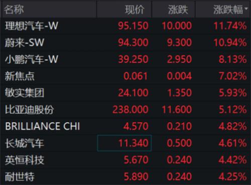 在交易日盤中未來和理想汽車的漲幅都超過了10%,比亞迪漲幅也超過了6%,另一個漲幅超過6%的是長城汽車,在盤中吉利汽車漲幅為5%,截止到午間收盤,蔚來汽車累計上漲幅度到達了11.53%,理想汽車的漲幅為10.69%,小鵬汽車漲幅為7.58%,大部分旅游概念股也出現了不同程度的上漲,截止到收盤中國中度H股上漲幅度達到了6.54%,在盤中上漲最高為8%,攜程集團上漲3%,同城旅行盤中上漲為1%。