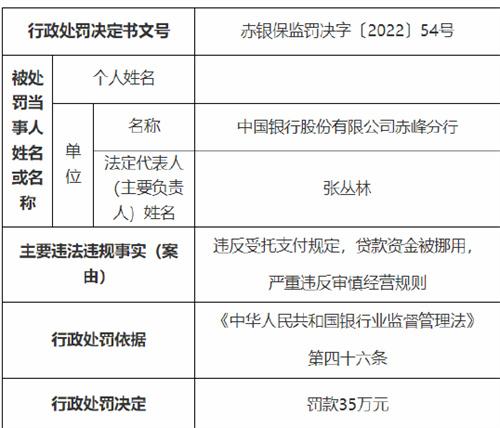 內蒙古赤峰銀保監局在1月20日公布了相關的行政處罰信息,中國銀行赤峰分行,因為嚴重違反了受托支付規定,挪用貸款資金,嚴重違反了審慎經營規則根據中華人民共和國銀行業監督管理法第46條被處以35萬元的罰款,同時對于相關責任人王繼紅作出警告處理,處罰決定日期顯示是2022年的11月21日,國家近幾年來對于銀行業的資金挪用等違規行為加大了監管力度。
