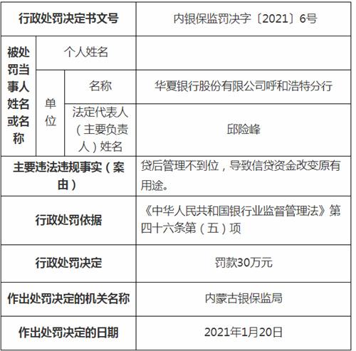 對工商銀行南平建陽支行給予了130萬元的罰款,并且對相關責任人進行了警告處理,除此之外,工商銀行南平分行和南平延平支行都是因為未盡到貸前調查和貸后管理的職責,導致了貸款資金被挪用,兩家銀行也都被罰款30萬元,相關責任人也可以用了警告處理,如果挪用了銀行的貸款資金,是需要承擔相應的違約責任,對于提供貸款的機構將會不再發放貸款等處罰,對于當事人申請貸款的條件就包括了貸款的用途需要明確合法,而且貸款人的信用狀況也必須良好,沒有重大的不良信用記錄。