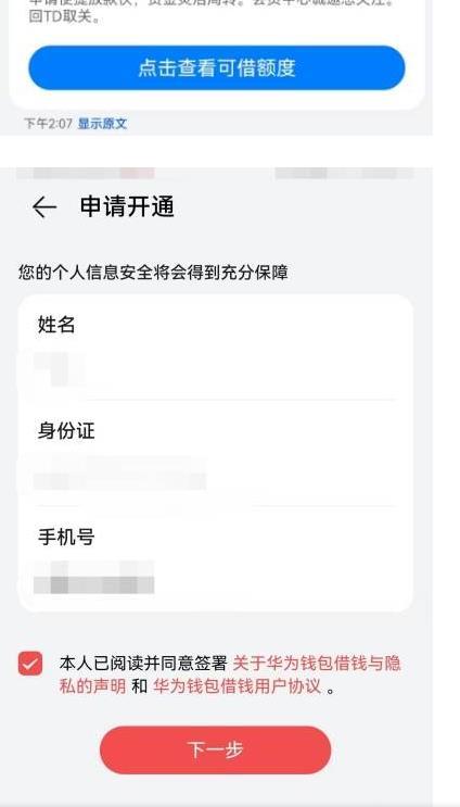 華為錢包專屬額度高達30萬元,申請簡單,極速放款,借還靈活,會員中心向華為手機會員發送了這樣的信息。會員按下“下一步”按鈕后需要進行人臉印證的步驟,對會員面部信息進行采集,并提示標注面部信息將用于借錢的授信,簽約及提款業務的身份識別認證。