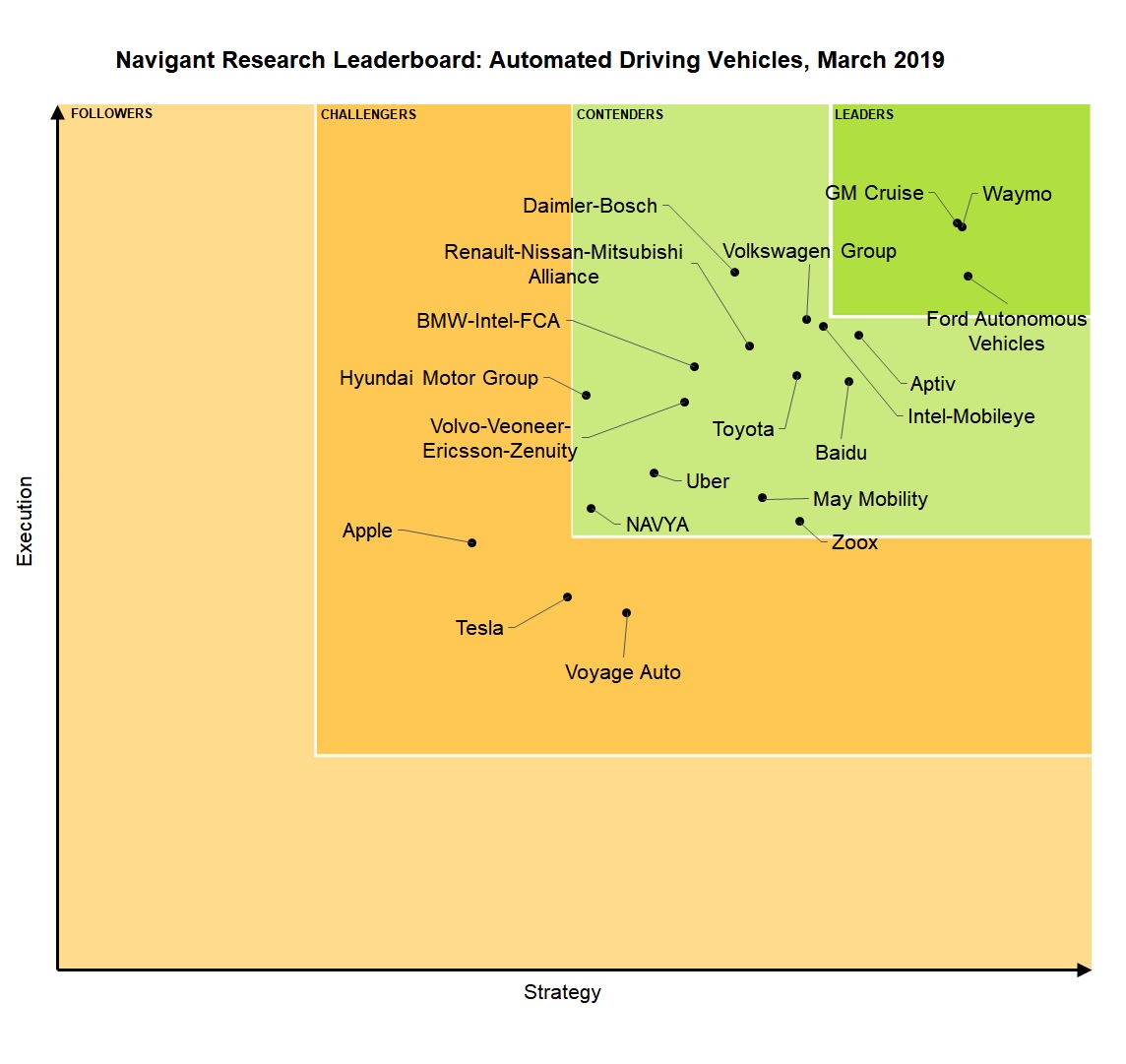 排行榜根據(jù)十種不同的自動(dòng)駕駛標(biāo)準(zhǔn)對公司進(jìn)行排名。這些包括戰(zhàn)略愿景,上市規(guī)劃,技術(shù),生產(chǎn)戰(zhàn)略,銷售和營銷,產(chǎn)品能力,產(chǎn)品質(zhì)量,產(chǎn)品組合,持久力和合作伙伴關(guān)系。今年,隨著制造商繼續(xù)與競爭對手和供應(yīng)商建立聯(lián)系,合作伙伴關(guān)系的重要性變得更加明顯。該研究將Waymo歸功于菲亞特克萊斯勒汽車和捷豹路虎,以及沃爾瑪,安飛士等公司的合作。同樣,它引用了通用汽車收購Cruise Automation以及與Softbank,Honda和DoorDash的合作關(guān)系。它還為與Argo AI,Lyft和Postmates合作以及與大眾汽車公司建立合作伙伴關(guān)系的談判提供了高分。