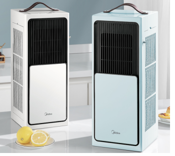 Midea CarryCool采用矩形形狀,頂部有一個皮革提手,可以將其提起。它不僅體積小巧,而且重量也很輕,僅重10kg。該空調采用雙渦輪離心風道技術,從兩側吸入空氣,冷卻后再從前部吹出。風量為180m 3 / h,送風距離可達4m。